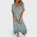 Godetevi il comfort e l'eleganza senza tempo con l'abito Naia. Realizzato in una morbida miscela di materiali pregiati, questo abito offre una sensazione di traspirabilità, leggerezza e fluidità, perfetta per le assolate giornate primaverili. Il taglio casual e l'accattivante scollatura a V creano un look elegante e disinvolto, ideale per ogni occasione.