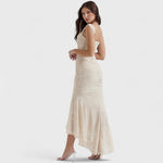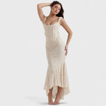 L'abito lungo Carisia incarna l'eleganza senza tempo con la sua delicata struttura in pizzo e la vestibilità che esalta la silhouette. Perfetto per matrimoni, feste in giardino o qualsiasi momento che richieda raffinatezza e delicatezza.