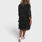 L'abito Clara emana pura eleganza con un raffinato motivo a pois. Le maniche a tre quarti e lo scollo rotondo conferiscono un look classico, mentre gli strati sovrapposti creano una silhouette dalla bella caduta.