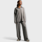 Completo da donna in maglia elegante composto da un maglione largo e pantaloni ampi. Realizzato in un materiale morbido e piacevole al tatto, garantisce comfort e un aspetto elegante. Il maglione ha spalle leggermente cadenti e un colletto delicato che gli conferisce un carattere moderno. I pantaloni ampi sottolineano lo stile casual e alla moda, ideale per le giornate più fresche. Il completo è perfetto sia per look quotidiani che per uscite più informali.