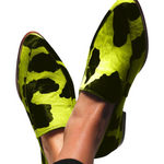 Aggiungi un tocco giocoso al tuo guardaroba con i nostri mocassini con stampa in pelle di mucca, perfetti per un look quotidiano irresistibile. Grazie alla loro forma affusolata, questi mocassini offrono una silhouette elegante e raffinata che si abbina meravigliosamente a outfit casual.